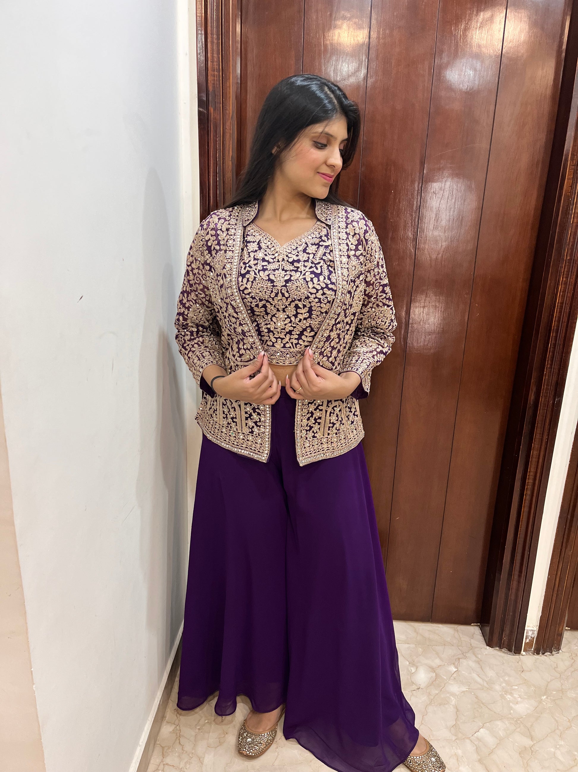 Hand embellished jacket with crop top and sharara - 3 piece indo western dress