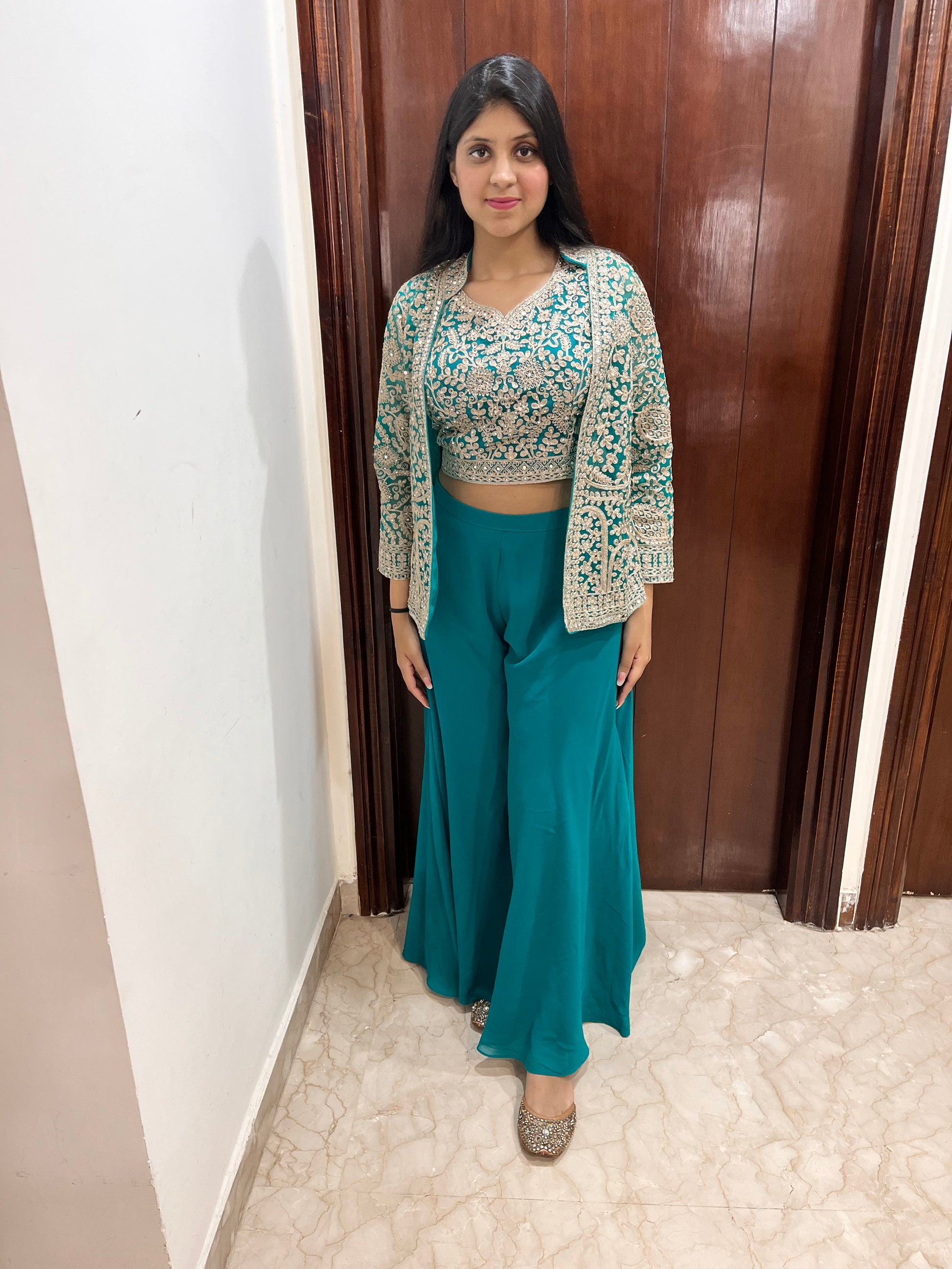 The sharara set and jacket can also be separated to style them individually — the jacket over a classic maxi dress or the sharara bottom with a crop top — offering versatility across multiple occasions