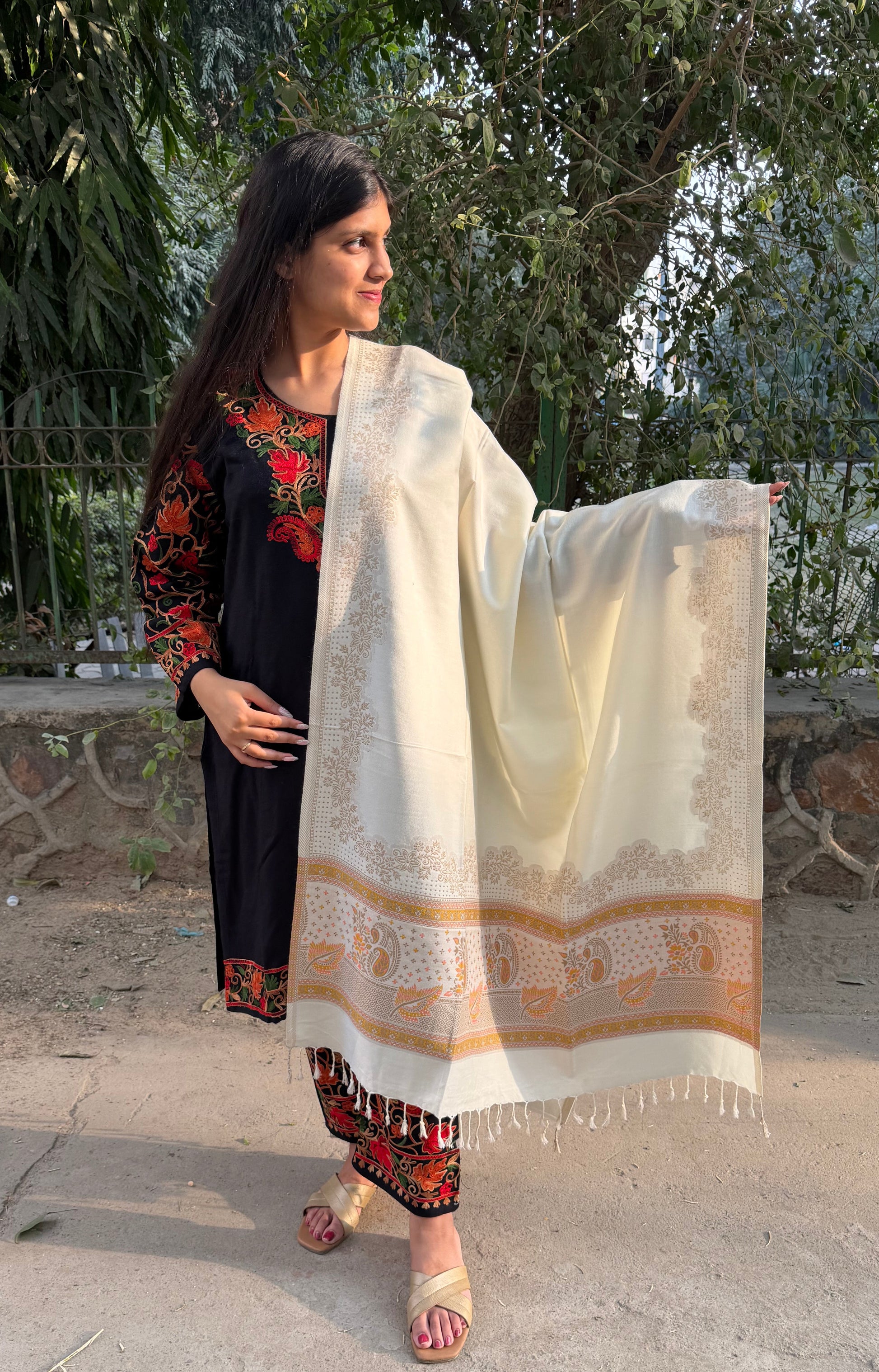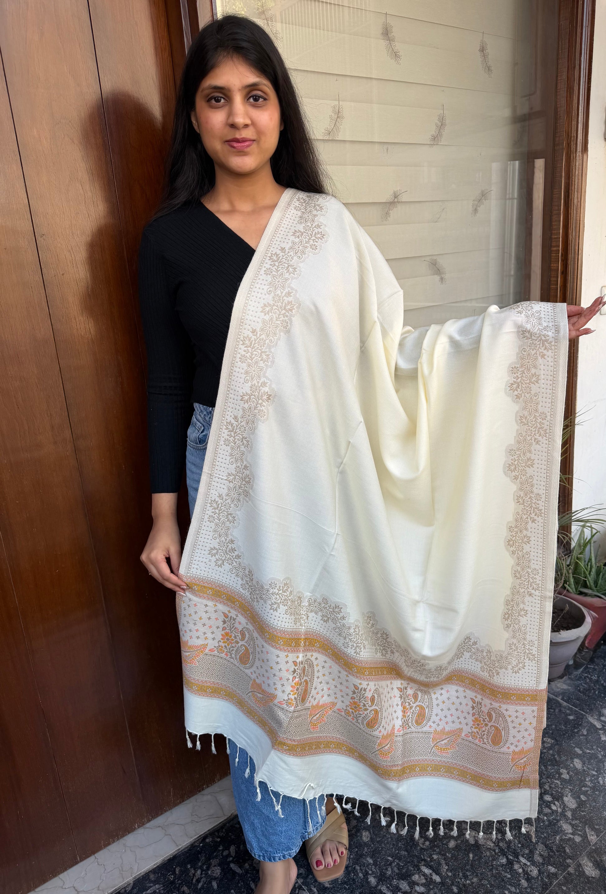 WHITE ETHNIC PUREWOOL DESIGNER SHAWL