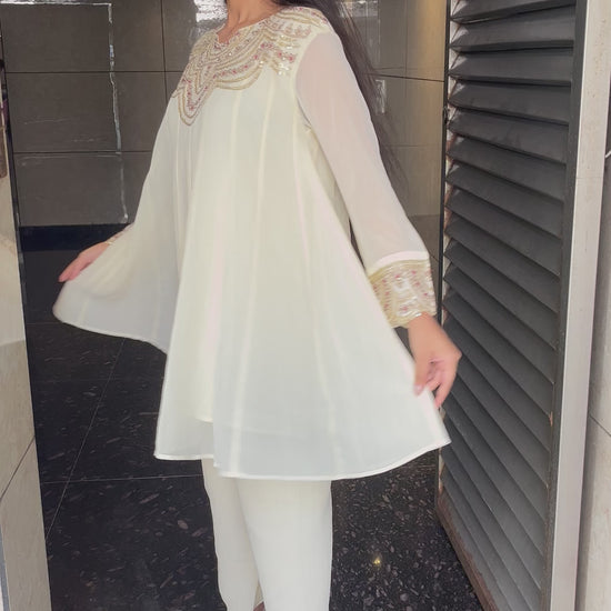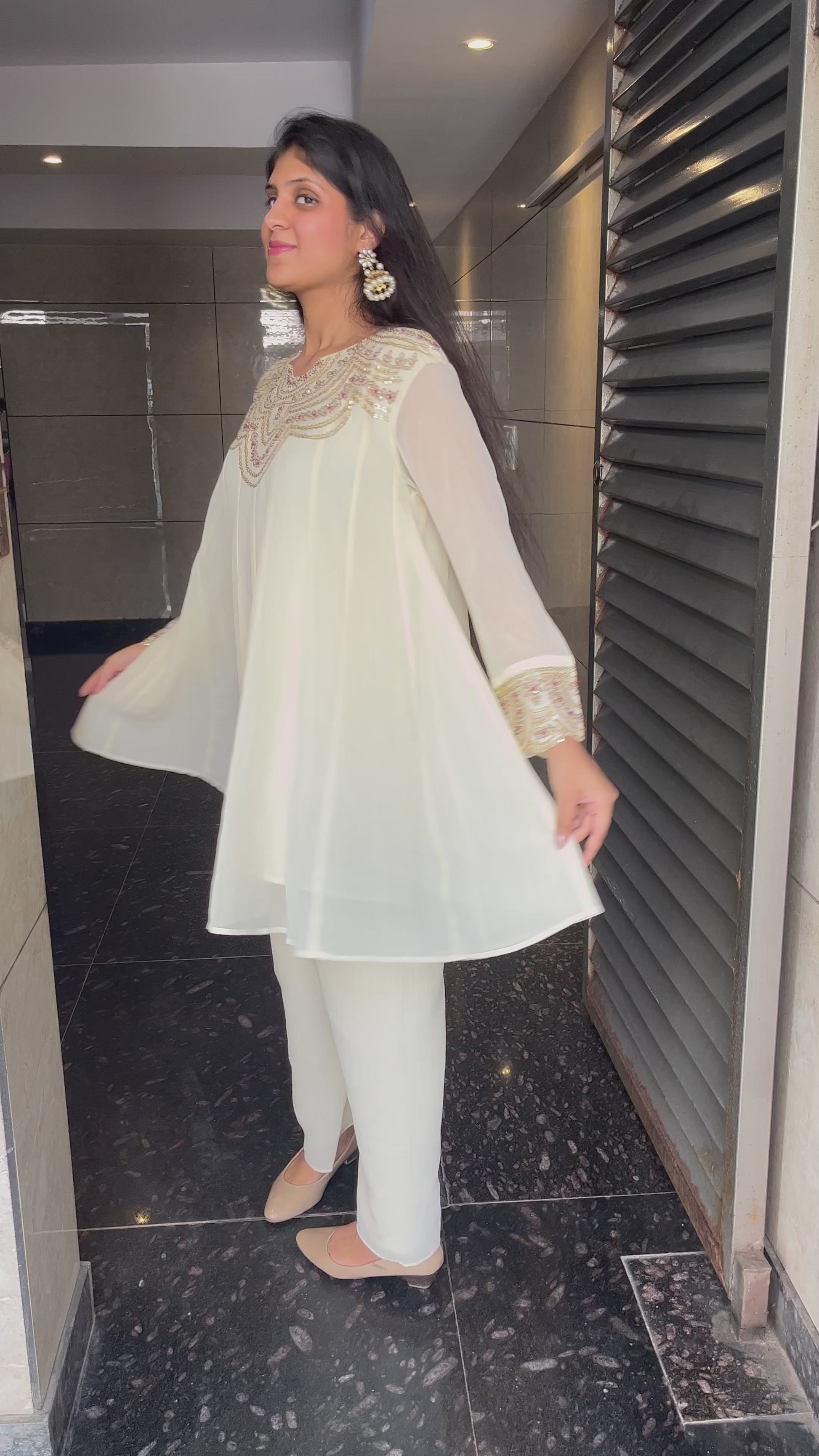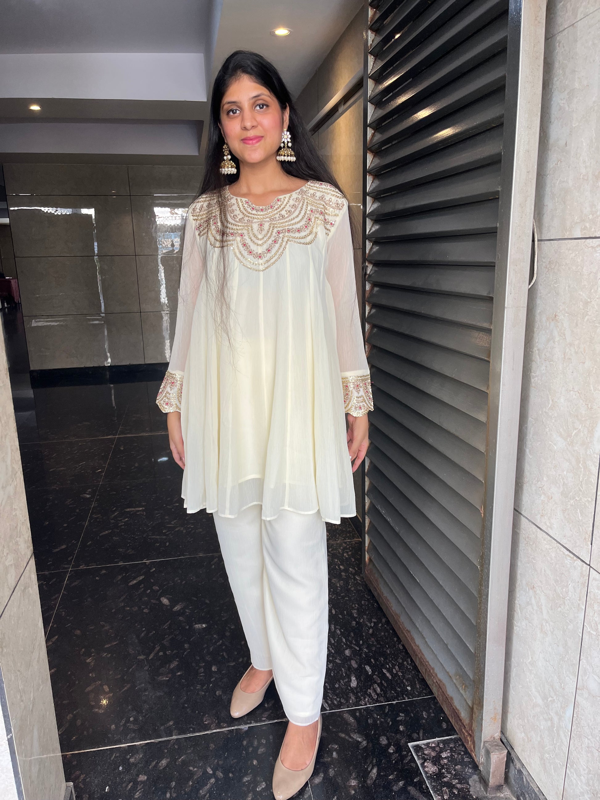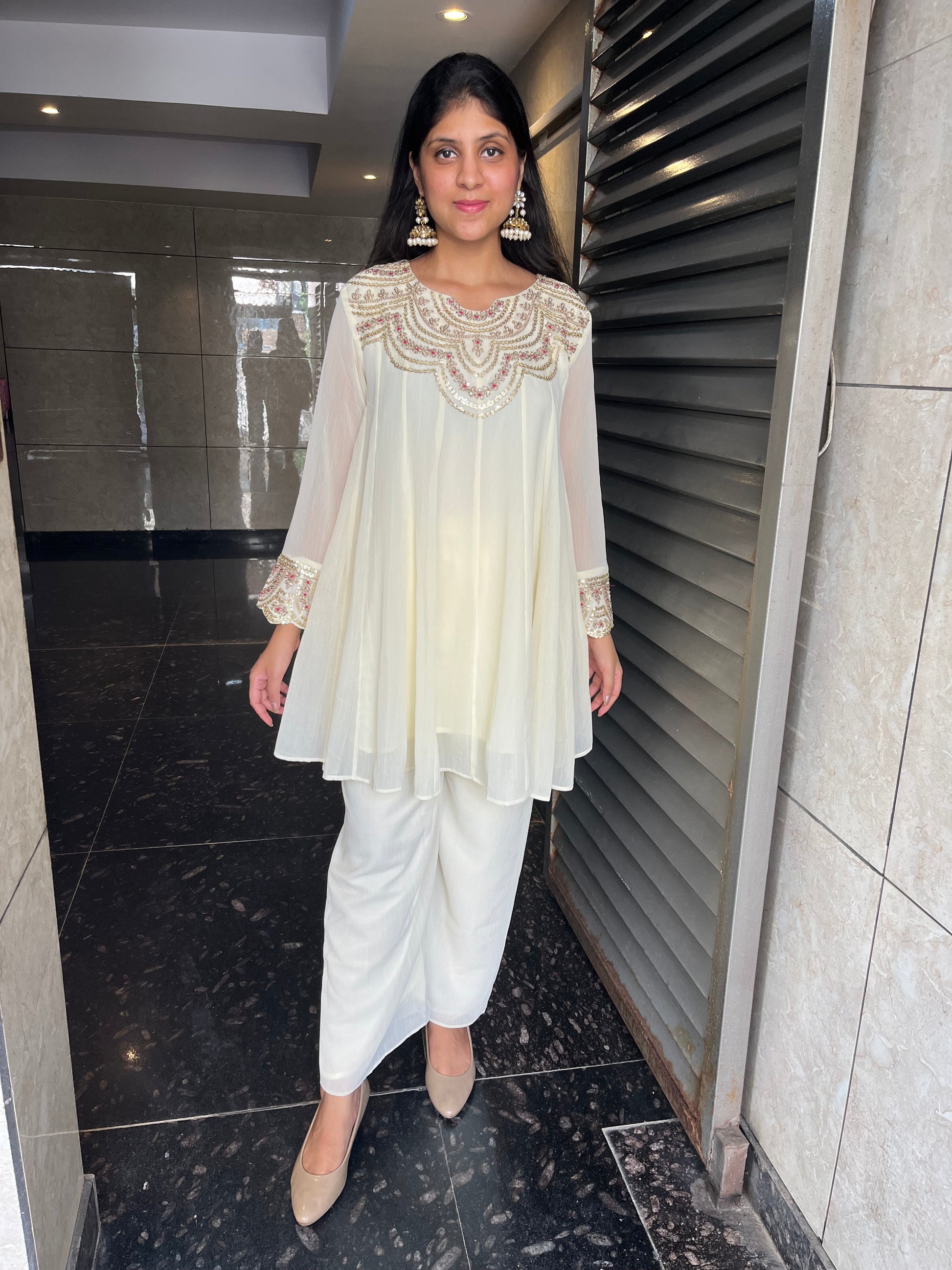 Brighten up your wardrobe with this hand embellished ivory co-ord set — a perfect blend of traditional craftsmanship and modern style. Adorned with intricate embroidery and authentic detailing, this off white co-ord offers a festive-ready look ideal for special occasions, boho style lovers, or just making a statement wherever you go.