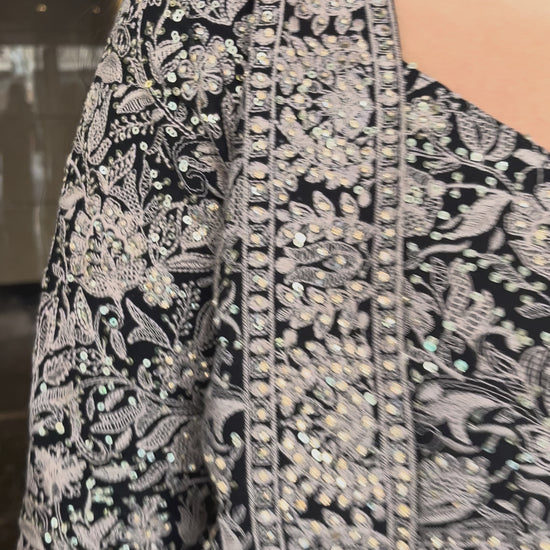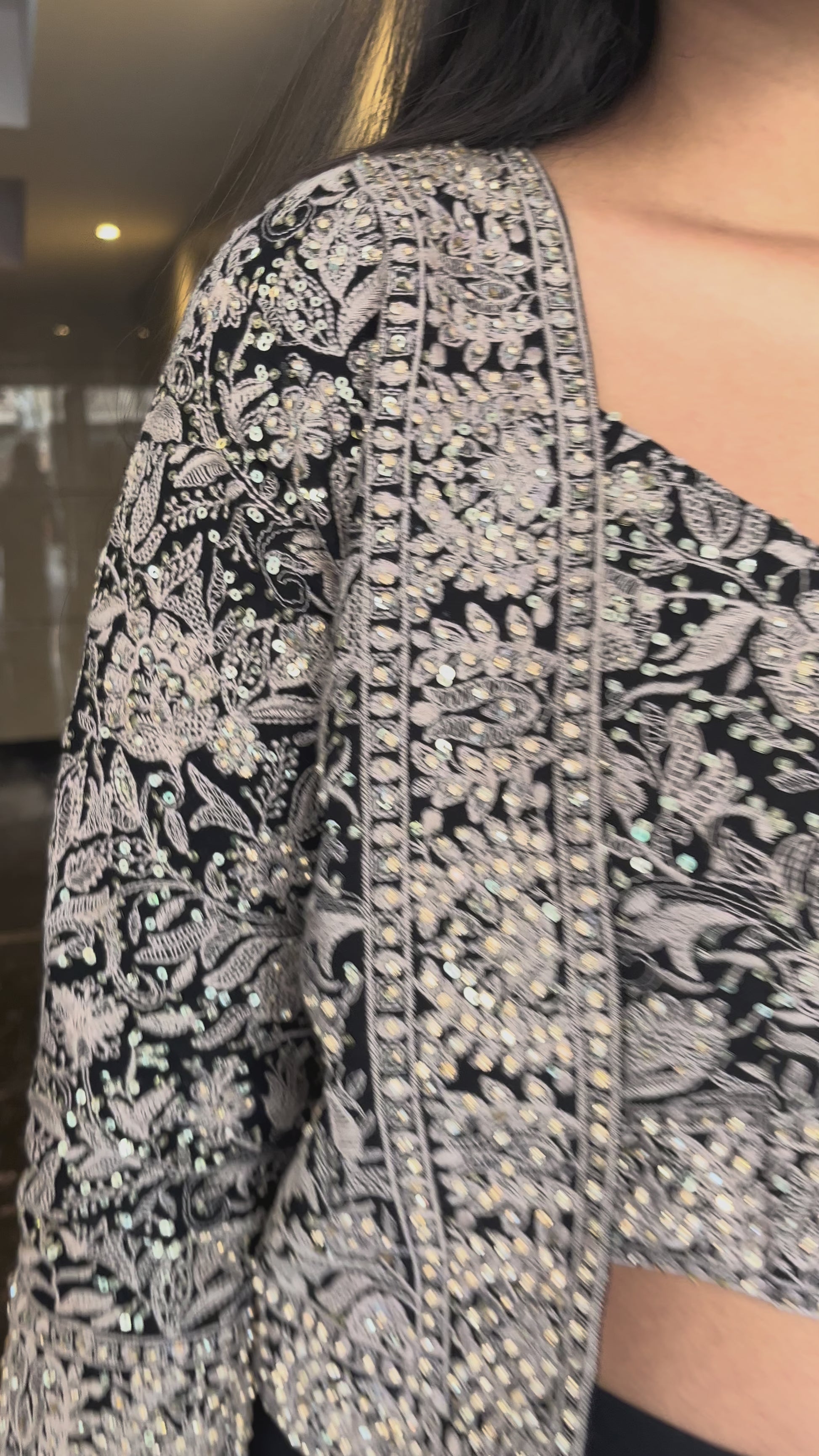 The sharara set and jacket can also be separated to style them individually — the jacket over a classic maxi dress or the sharara bottom with a crop top — offering versatility across multiple occasions