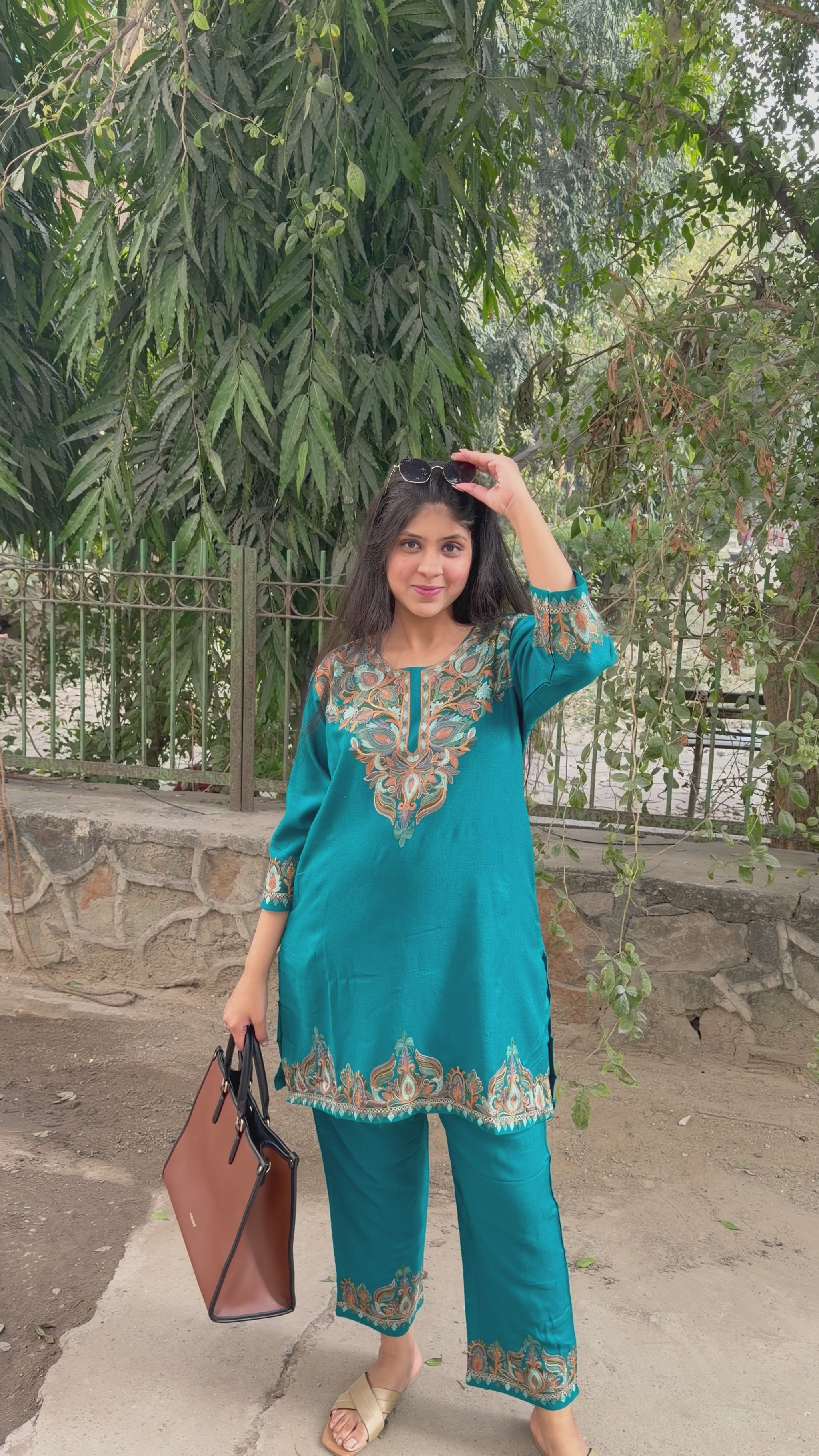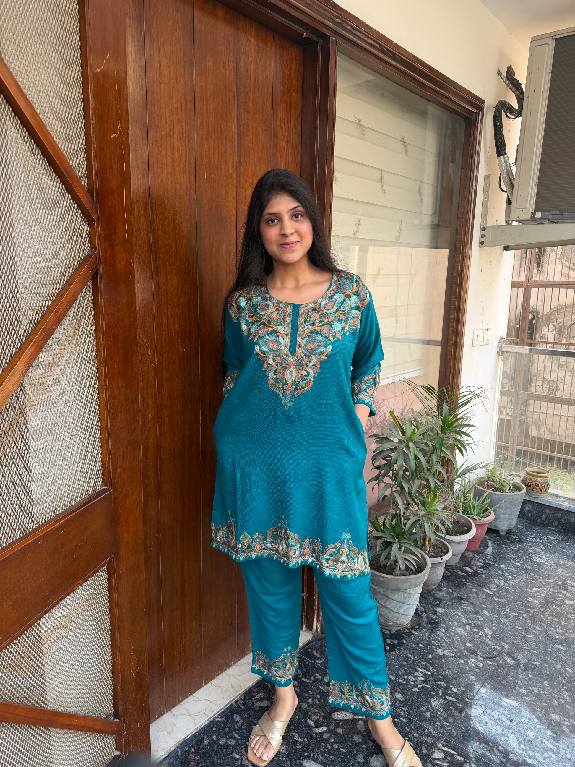 Hand embroidered made with pure wool fabric and adorned with Kashmiri aari work not just on kurta but pants too . This piece is perfect for upcoming winter season