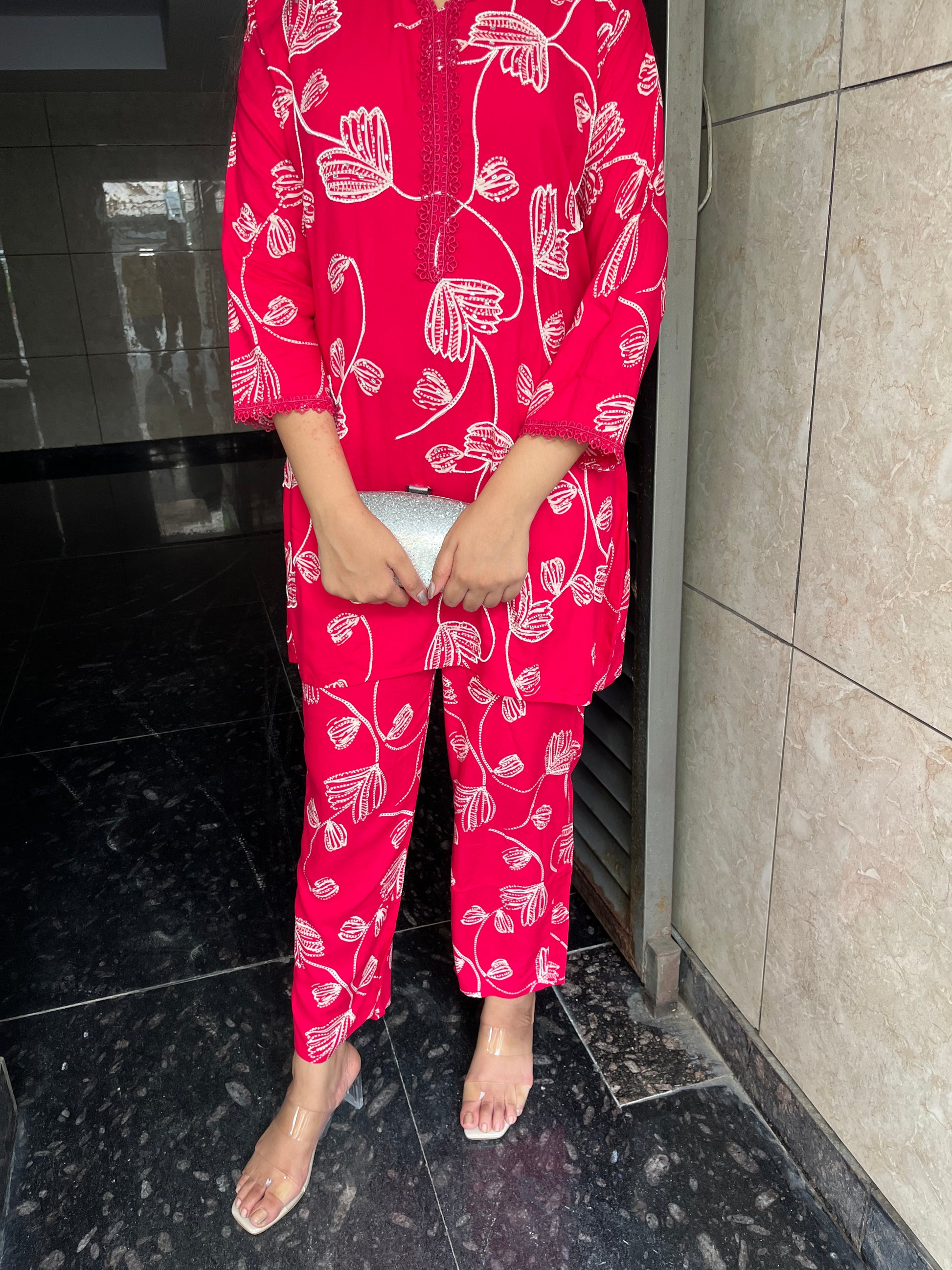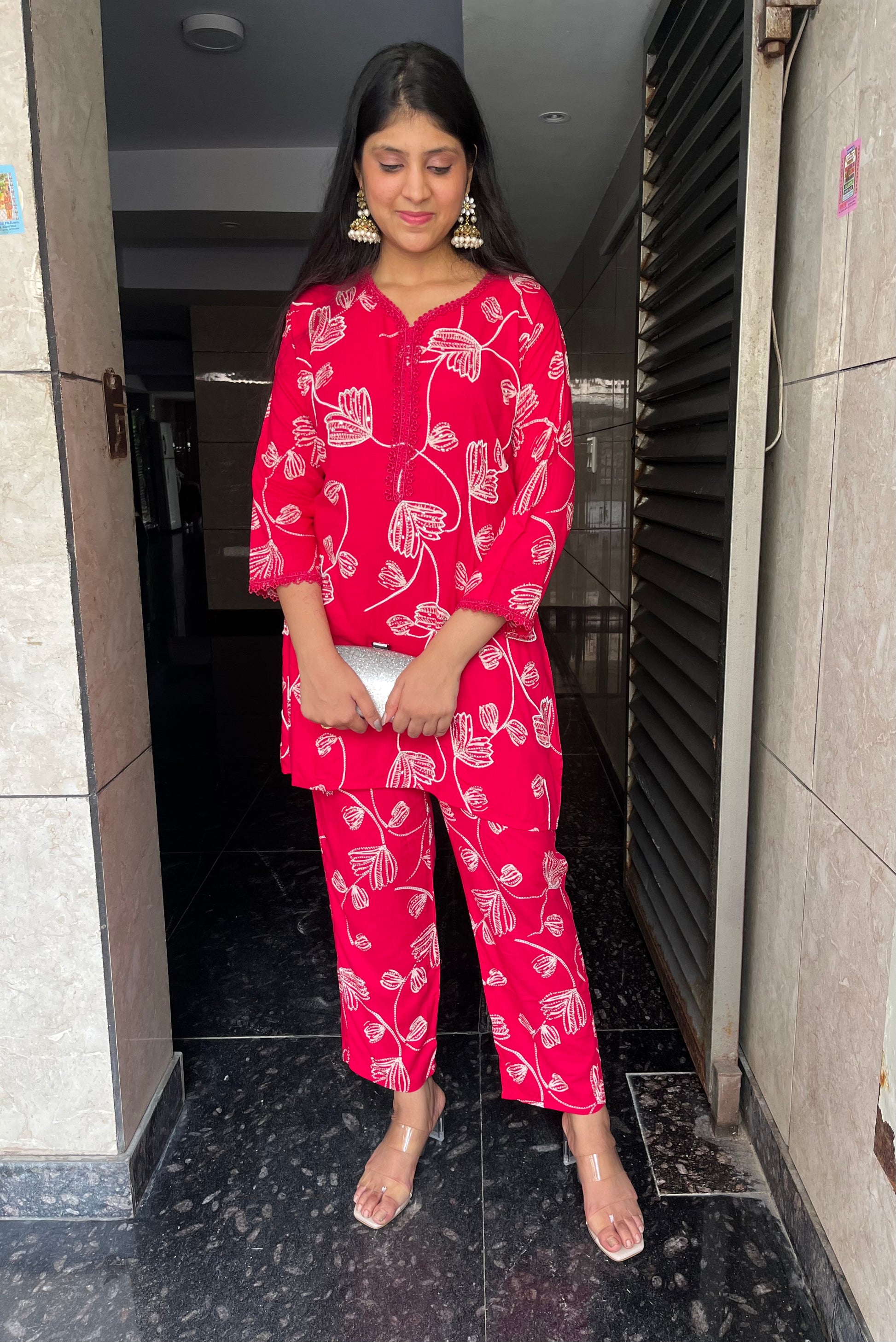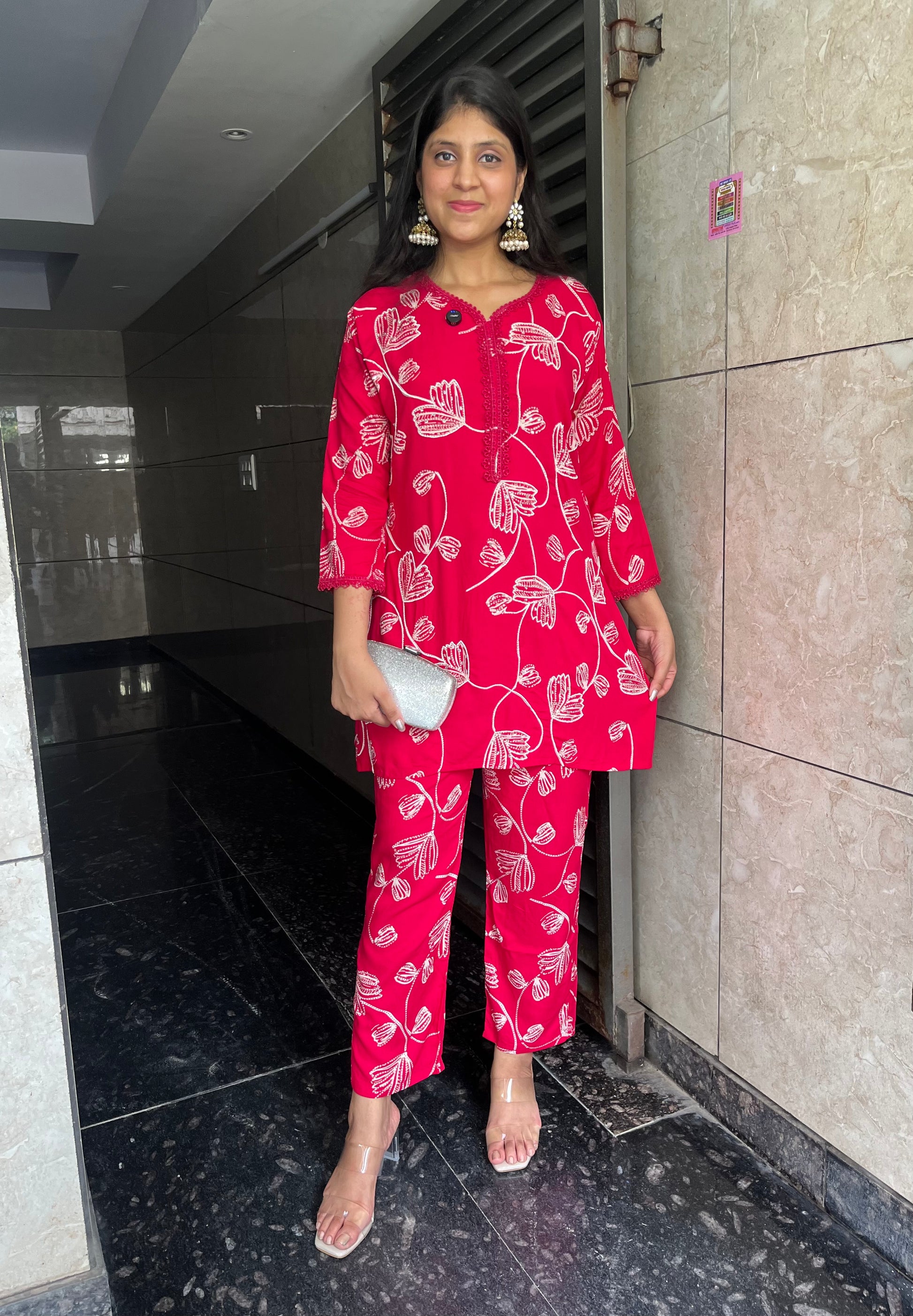 Brighten up your wardrobe with this party wear co-ord set — a perfect blend of traditional craftsmanship and modern style. Adorned with intricate embroidery and authentic mirror work detailing, this red co-ord offers a festive-ready look ideal for special occasions, boho style lovers, or just making a statement wherever you go.