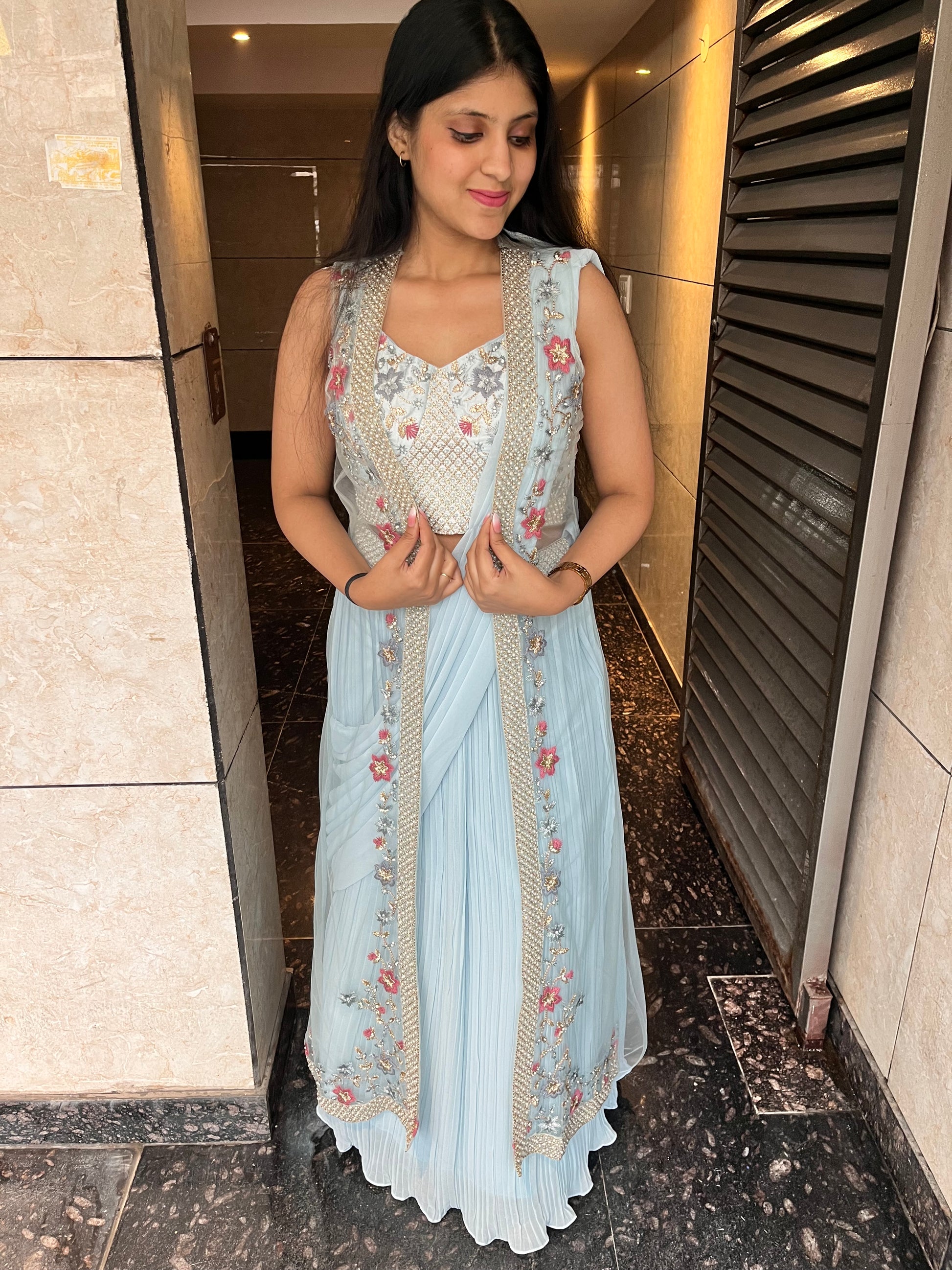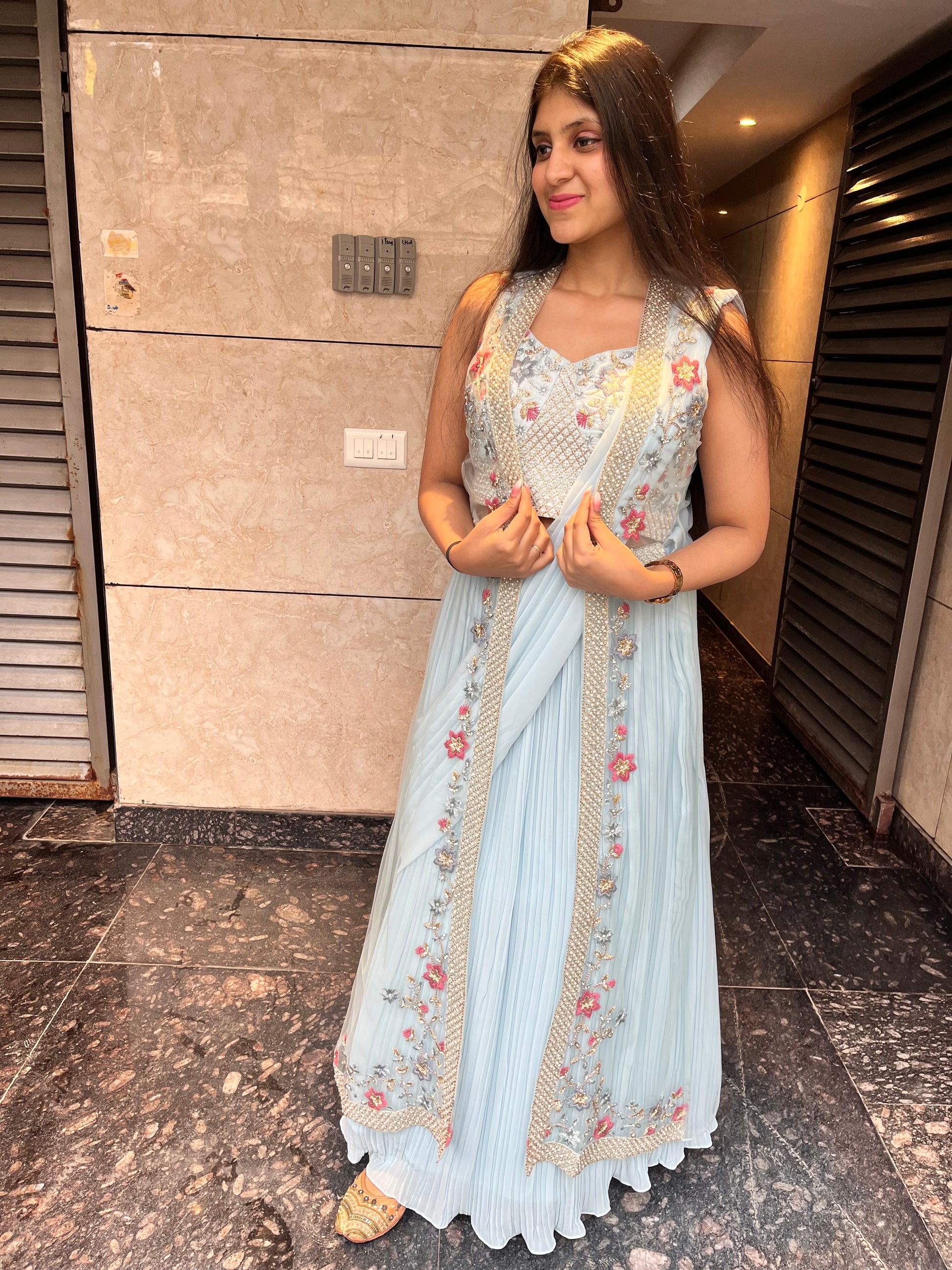 Elevate your style with this exquisite sequence indo‑western dress , blending traditional Indian flair with contemporary silhouette. This striking sequence dress from Karigari by Aakriti features a richly hand‑embellished cape, a tailored crop top, and a flowing skirt — perfect for weddings, festive events, receptions etc